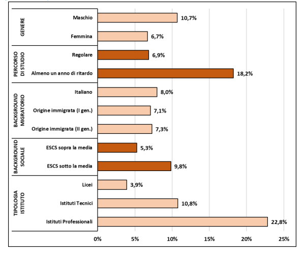 La scuola italiana registra alti tassi di ripetenza e di abbandono, il che si traduce in pochi studenti che accedono alla formazione terziaria e nella mancanza di capitale umano altamente specializzato. Solo il 6,6% dei diplomati professionali e il 20,95% dei tecnici accede all’università, contro oltre il 70% dei liceali. L’Italia resta così fra i Paesi OCSE con meno laureati nella fascia di età 25-34 anni e con alta quota di NEET.