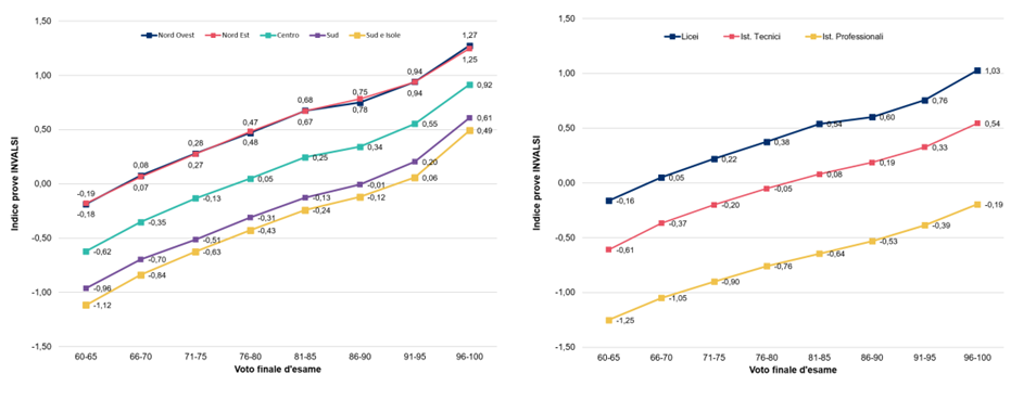 Dislivelli geografici e interscolastici sono marcati: al Sud abbandono e dispersione sono più alti; nelle prove INVALSI i licei superano costantemente la media nazionale, mentre gli istituti professionali riportano esiti nettamente inferiori. Il background familiare, inoltre, incide già dalla primaria. Esiste una disuguaglianza valutativa che si rileva nei voti di maturità, i quali non riflettono le competenze misurate da INVALSI e non sono confrontabili.