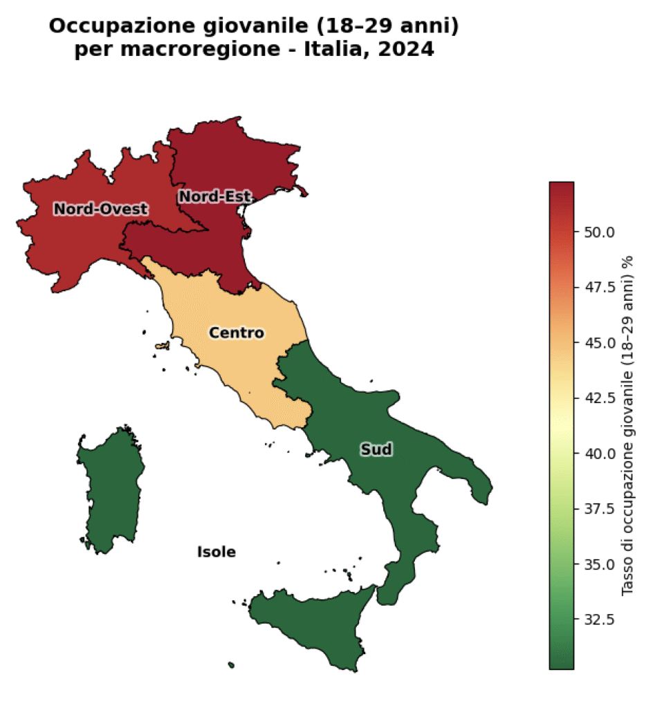 Nel 2024 il tasso di occupazione ha raggiunto il massimo storico del 67,1%, ma resta ben al di sotto della media europea (75,8%). Persistono pesanti divari territoriali, generazionali e di genere: l’occupazione femminile raggiunge il 57,4% contro il 70,8% europeo, mentre tra i giovani il dato si ferma al 34,4% a fronte di una media UE del 49,5% (Figura 1).