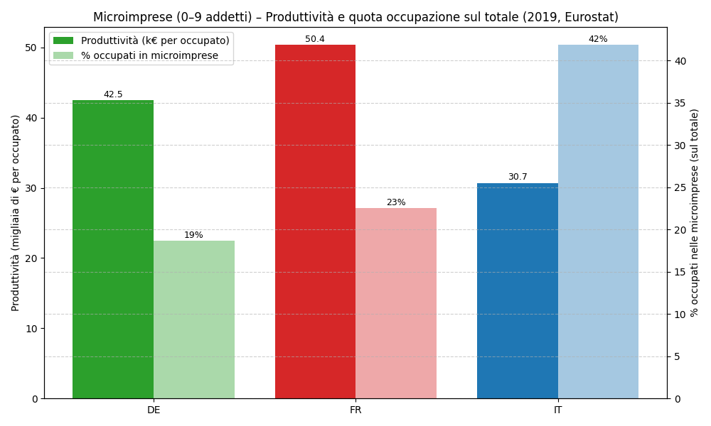 Alla bassa occupazione si aggiunge una produttività stagnante. Negli ultimi vent’anni la produttività oraria è cresciuta solo del 2,5% contro una media europea del 19,6%. Il tessuto produttivo, dominato da microimprese con meno di 9 dipendenti, fatica a investire in innovazione e formazione (Figura 2). Come risultato, i salari sono fermi in termini reali da oltre 20 anni.