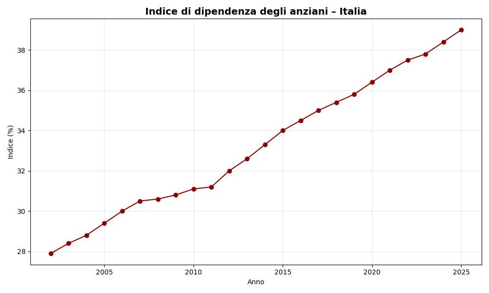 L’evoluzione demografica aggrava lo scenario: la popolazione in età lavorativa diminuisce, mentre cresce il numero di anziani (Figura 3). In Italia, nel periodo 2000-2021, la speranza di vita è salita da 79,6 a 82,7 anni, e il calo delle nascite compromette il ricambio generazionale.