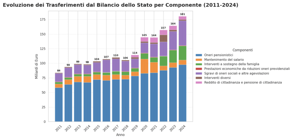 La sostenibilità del sistema previdenziale risente delle difficoltà del mercato del lavoro: i contributi non bastano a coprire la spesa pensionistica corrente. L’INPS spende complessivamente oltre 400 miliardi a fronte di 240 miliardi di contributi. La differenza viene coperta con trasferimenti dalla fiscalità generale, saliti da 99 miliardi nel 2013 a 180 miliardi nel 2024 (Figura 4).