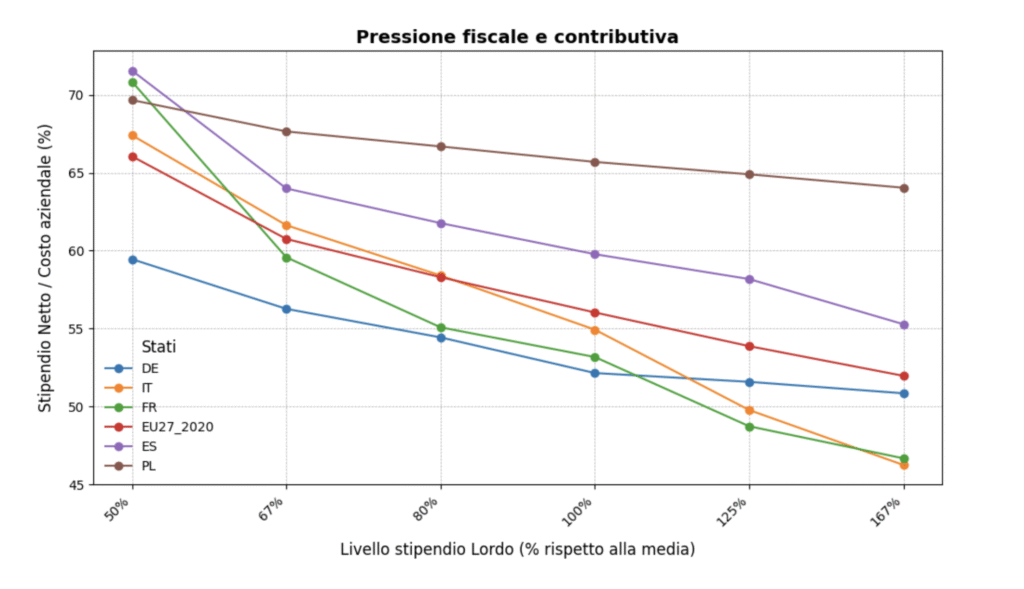 Gli alti costi contributivi influenzano il mercato del lavoro, abbassando gli stipendi netti: un lavoratore medio oggi trattiene solo il 55% del proprio costo aziendale, percentuale che scende al 46% per retribuzioni più alte, performance tra le peggiori in Europa (Figura 8).