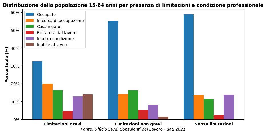 L’inclusione lavorativa delle persone con disabilità rimane inadeguata. Secondo dati 2023, solo il 33% dei 15-64enni con gravi limitazioni è occupato (Figura 9). Sul versante del collocamento, il ricorso all’esonero è ampio.