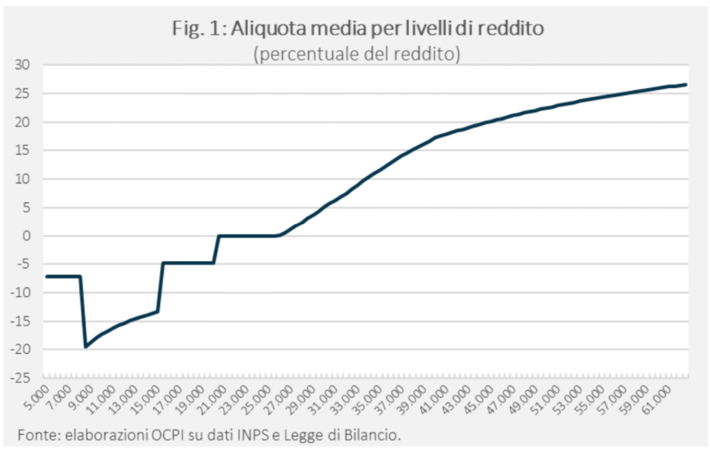 L’IRPEF è un’imposta progressiva a scaglioni. L’imponibile è determinato sottraendo al reddito lordo una serie di deduzioni, la più importante delle quali è rappresentata dai contributi previdenziali e assistenziali. Dal periodo d’imposta 2025 gli scaglioni sono tre: 23% per la quota di reddito fino a 28.000 euro, 35% per la quota tra i 28.000 e i 50.000 euro, 43% per la quota superiore a 50.000 euro. L’imposta viene poi ridotta da un’articolata serie di detrazioni classificabili in due categorie principali: quelle che spettano in base alla tipologia di reddito da lavoro percepito e quelle che invece sono legate a spese effettivamente sostenute. Le prime sono soggette ad una riduzione progressiva all’aumentare del reddito, un meccanismo che da un lato comporta squilibri notevoli nelle aliquote marginali e dall’altro permette virtualmente una fascia esente di reddito (circa fino a 8.500 euro). Gli oneri detraibili, invece, sono rappresentati da una serie di spese quali, ad esempio, le ristrutturazioni edilizie, gli interventi di risparmio energetico, le spese mediche e per farmaci, le spese d’istruzione, gli interessi passivi sui mutui ipotecari e altre.