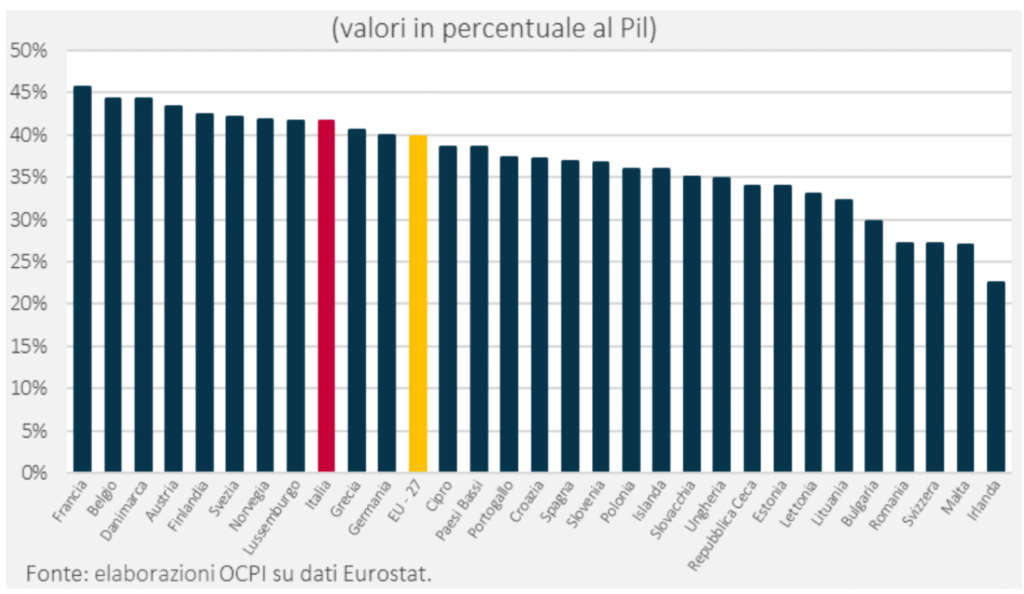 La pressione fiscale italiana (41,4% nel 2023), sebbene superiore alla media UE (39,8%), non è la più elevata d’Europa. Nel 2023, l’Italia era al nono posto, dietro Francia (45,6%), Belgio, Austria, Lussemburgo e Paesi scandinavi.